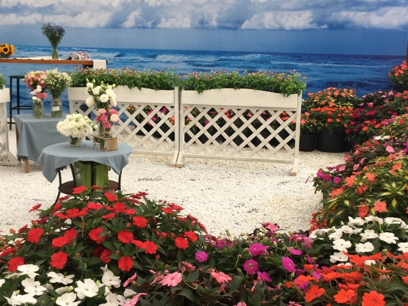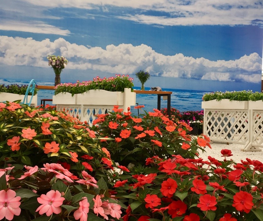 在坂田公司的展位上,我們主打“桑蓓斯®”的盆栽組合應(yīng)用,采用藍(lán)天白云,細(xì)石白沙為背景,為參觀者營(yíng)造出在海邊漫步,被鮮花簇?fù)淼睦寺諊T谑彝?,也大量種植了桑蓓斯,采用已有的多個(gè)花色進(jìn)行組合,達(dá)到室內(nèi)外相互呼應(yīng)的效果。