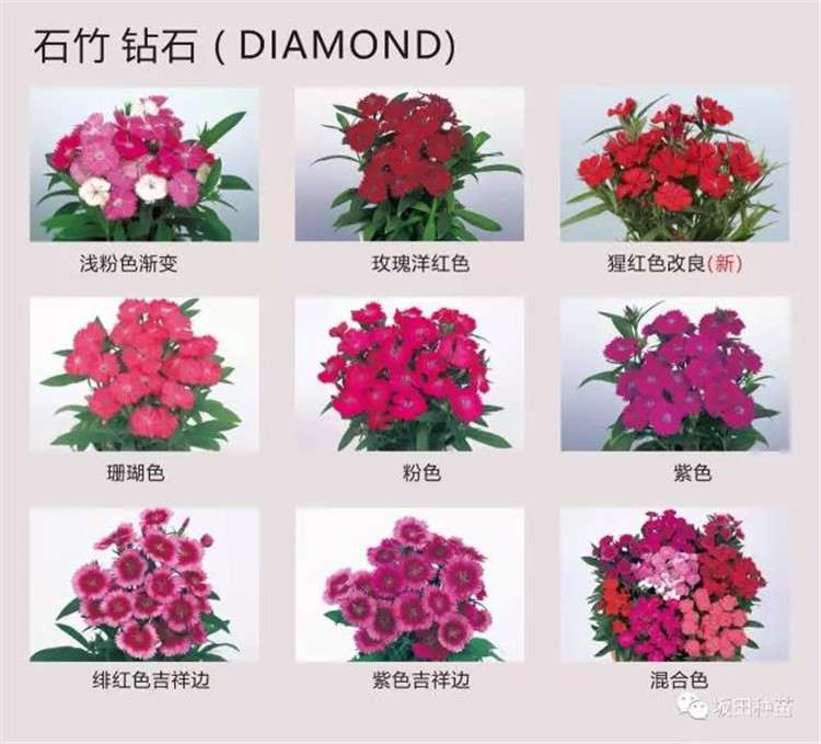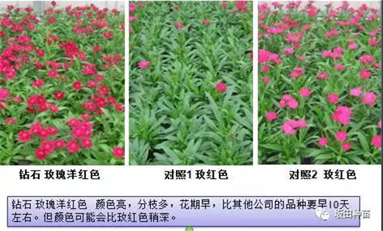 石竹鉆石系列是由坂田公司培育的優(yōu)良品種。此系列春秋季節(jié),花壇表現(xiàn)特別精彩。植株長(zhǎng)勢(shì)一致,花期早,耐熱性好!目前可以提供9個(gè)單色+混合色,通過代理商在國(guó)內(nèi)銷售。