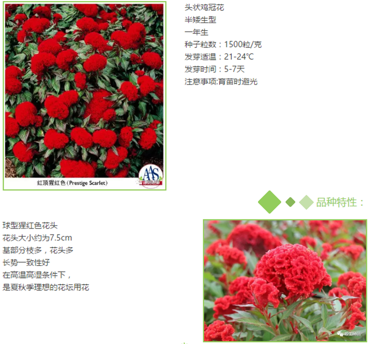 聊完了群株炫彩的雞冠花,讓我們?cè)倏纯礆v經(jīng)二十年而不衰的經(jīng)典品種-雞冠花紅頂系列!是由坂田公司精心培育的優(yōu)良品種。并于1997年榮獲AAS大獎(jiǎng)。