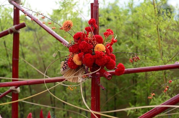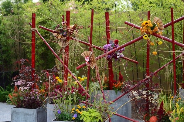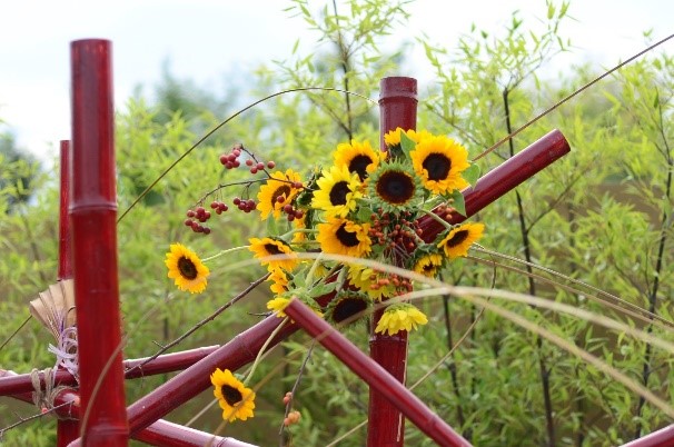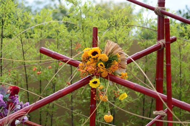 秋季展示著重應(yīng)用雞冠花“世紀(jì)”、彩葉草“絢麗彩虹”、“航路”、百日草“豐盛”、“重瓣豐盛”渲染秋日氛圍,切花雞冠花“首領(lǐng)”、向日葵“文森特”、洋桔?!安ɡ恕?、“蕾娜”等系列做重點(diǎn)強(qiáng)調(diào)。結(jié)合架構(gòu)強(qiáng)烈的朱紅色和金色竹篾飄帶,令觀眾印象深刻。