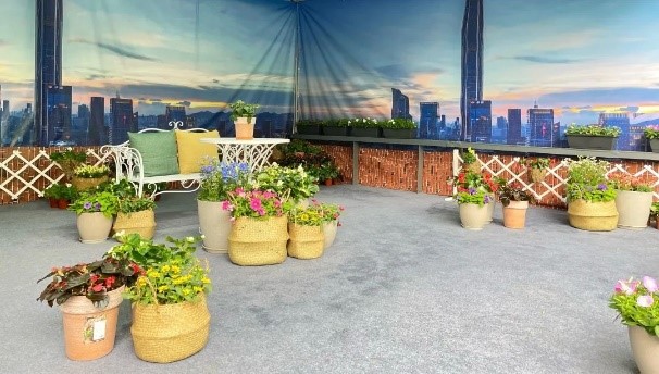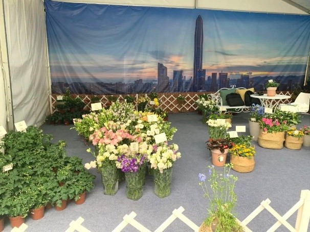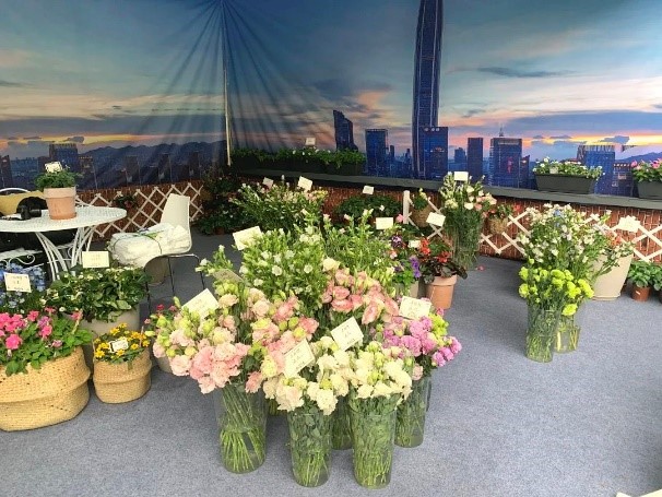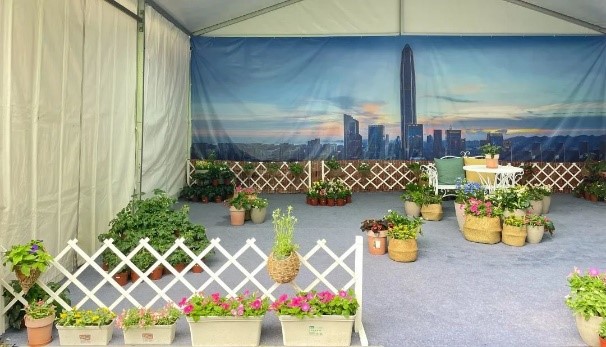 坂田花卉展位,以都市與自然為主題打造了一個幽靜的天空花園,都市是借用了深圳的城市圖,作為花園的主體背景;