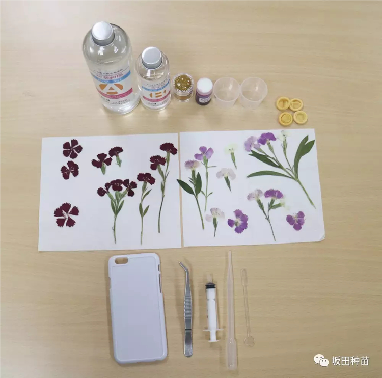 制作材料與工具:空白手機(jī)殼(新手建議背面有凹槽)、押好的干花、水晶滴膠(AB膠)、膠水、一次性塑料杯、針筒、剪刀、鑷子、木棍、牙簽、紙巾