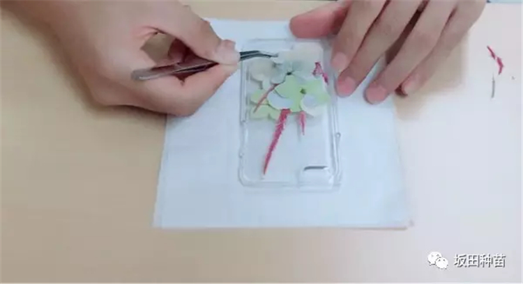 將押好的干花分類整理好,方便取用。用鑷子夾取干花放在手機(jī)殼背面,按照自己的設(shè)計(jì)提前擺放好,并拍照,方便后邊查看。