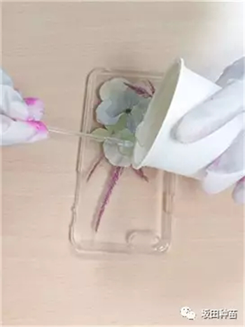 將配好的水晶滴膠從手機(jī)殼中間慢慢倒出,先少倒一些,以防后邊溢膠。