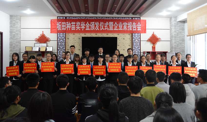 ? ? ? ?2017年10月18日下午,在山東農(nóng)業(yè)大學(xué)南校區(qū)舉行了坂田種苗獎(jiǎng)學(xué)金頒獎(jiǎng)儀式暨企業(yè)家座談會(huì)。出席儀式的有山東農(nóng)業(yè)大學(xué)園藝學(xué)院黨委副書(shū)記張安濤、農(nóng)學(xué)院黨委副書(shū)記王平、植保學(xué)院副書(shū)記兼副院長(zhǎng)劉志勇、坂田種苗(蘇州)有限公司副董事長(zhǎng)兼總經(jīng)理樓惠寶。園藝學(xué)院、農(nóng)學(xué)院、植保學(xué)院獲得2017年度“坂田種苗獎(jiǎng)學(xué)金”的24位同學(xué)以及部分學(xué)生代表參加了頒獎(jiǎng)儀式。頒獎(jiǎng)儀式由園藝學(xué)院黨委副書(shū)記張安濤主持進(jìn)行。