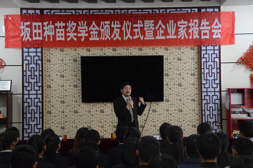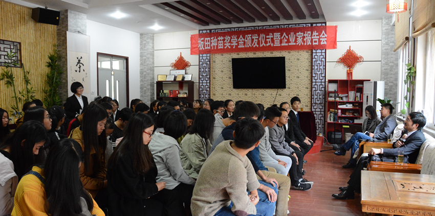 ? ? ? ?隨后,坂田種苗副董事長(zhǎng)兼總經(jīng)理樓惠寶先生與參加頒獎(jiǎng)儀式的全體學(xué)生進(jìn)行了精彩的報(bào)告會(huì)。會(huì)上樓惠寶副董事長(zhǎng)兼總經(jīng)理就學(xué)生關(guān)心的社會(huì)就業(yè)形勢(shì)、農(nóng)業(yè)行業(yè)的薪酬?duì)顩r、企業(yè)對(duì)應(yīng)屆畢業(yè)生的要求等方面作了報(bào)告。并與學(xué)生對(duì)就業(yè)等大家關(guān)心的事項(xiàng)進(jìn)行了意見(jiàn)交換。
