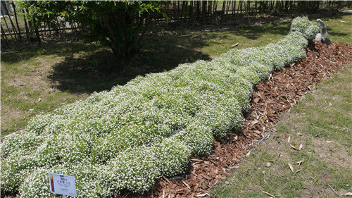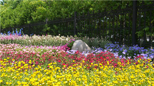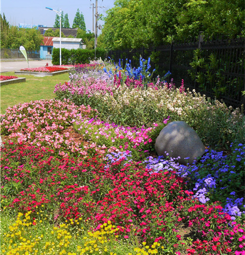 進入坂田種苗(蘇州)有限公司的大門,便可見右側(cè)大花壇運用花境設計方式種植了許多花卉品種,主要有紫羅蘭“四重奏”系列、藿香薊“藍色視野”、黃金菊“閃亮”、冰島虞美人“仙境”、銀蓮花“和諧”、大花飛燕草“燭光”系列、石竹“鉆石”系列、風鈴草“超級冠軍”系列和“冠軍”系列。
