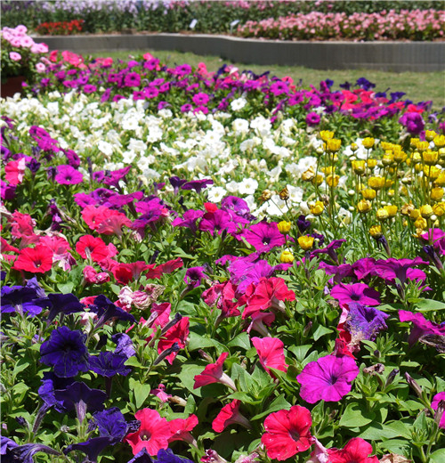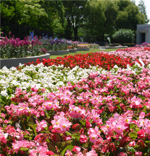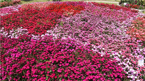 花壇應用著重展示了矮牽?!坝炅帧毕盗?、四季海棠“神曲”、“大使”、“議員”系列以及石竹“鉆石”系列。